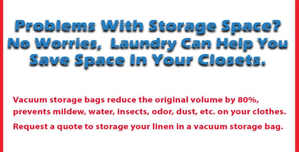Vacuum storage bags reduce the original volume by 80%, prevents mildew, water, insects, odor, dust, etc. on your clothes. Request a quote to storage your linen in a vacuum storage bag.